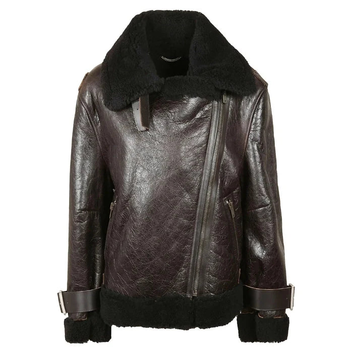Own the winter season with the Mirelda Sheepskin Shearling Leather Jacket, a sleek, modern piece...
