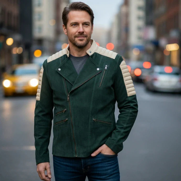 Why settle for traditional colors when you can stand out? The Timber Green Suede Biker...