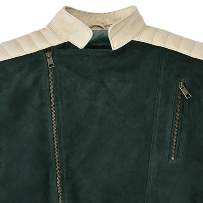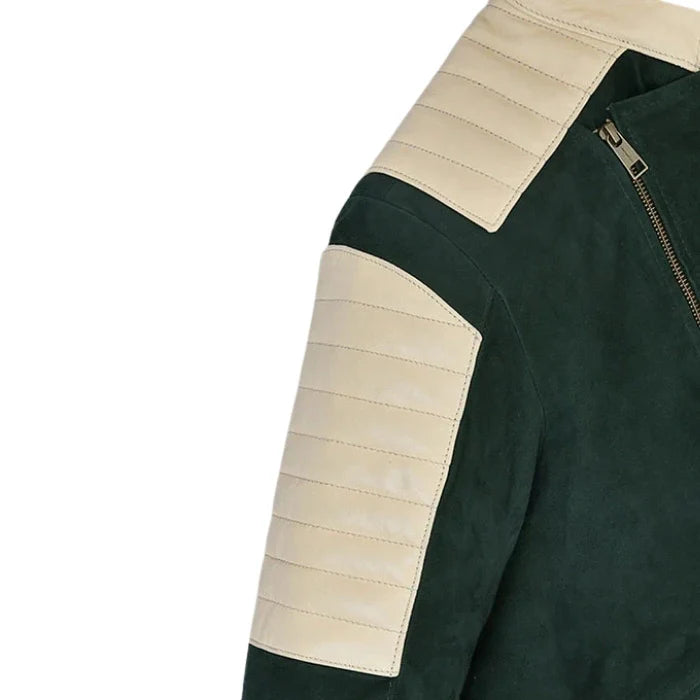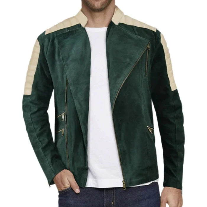 Why settle for traditional colors when you can stand out? The Timber Green Suede Biker Moto Jacket delivers charisma you’ve been craving.