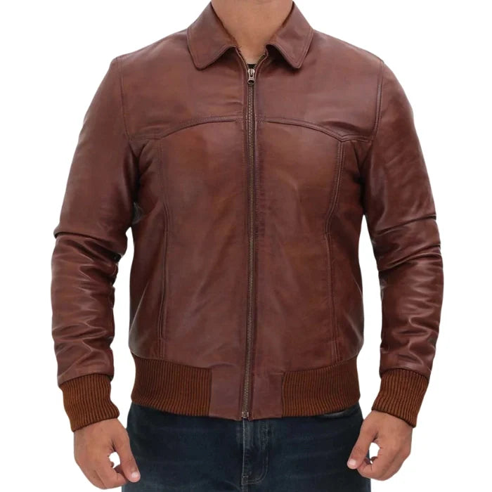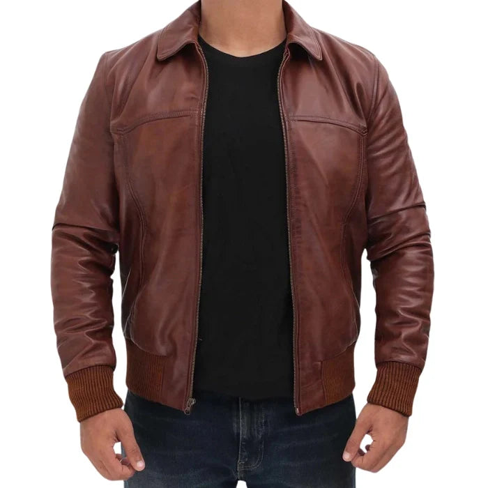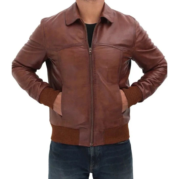 Men's Classic Shirt Collar Leather Bomber Jacket