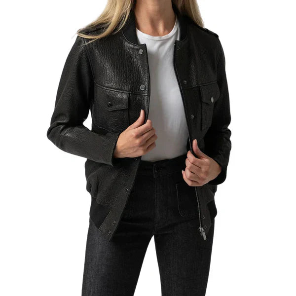 Your search for the softest natural leather and a ribbed neckline ends with this Black Leather Bomber Jacket. This jacket, made with softest, sustainable leather and a sleek design, offers a perfect blend of elegance and edge. Featuring functional pockets and premium hardware, it's the ideal companion for casual and semi-formal looks. Stay cozy and fashionable every season with this must-have wardrobe essential.