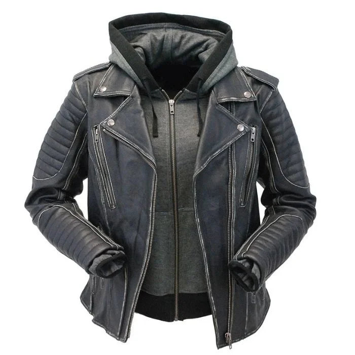 Women's Quilted Leather Moto Jacket with Hoodie